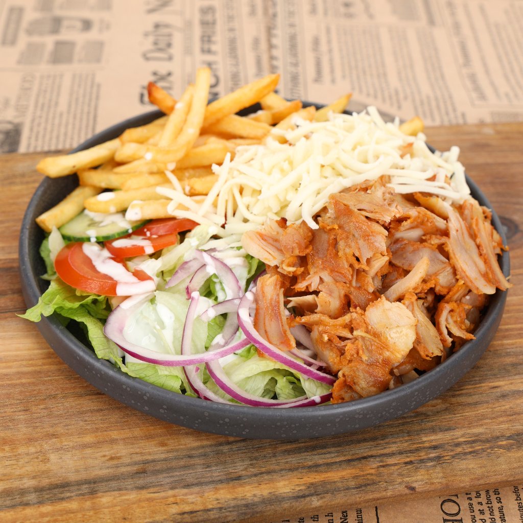 Ingrediencie: grilované kuracie mäso, syr, hranolky, ľadový šalát, uhorka, paradajka, cibuľa, dresing