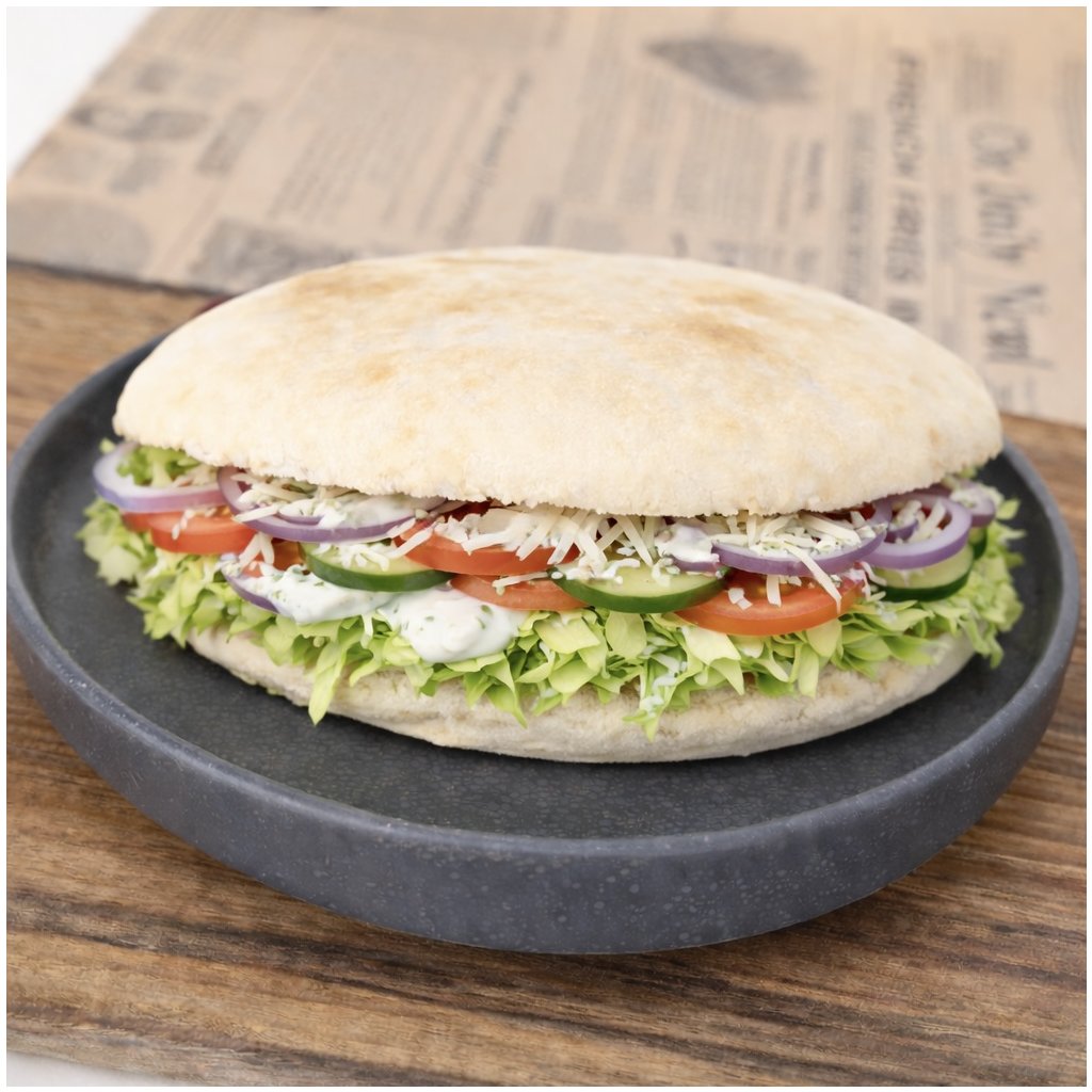 Ingrediencie: syr, domáci pita chlieb, ľadový šalát, uhorka, paradajka, cibuľa, dresing