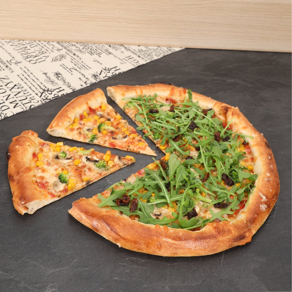 Ingrediencie: Pomodoro, mozzarella, sušené paradajky, šampiňóny, brokolica, kukurica, rukola